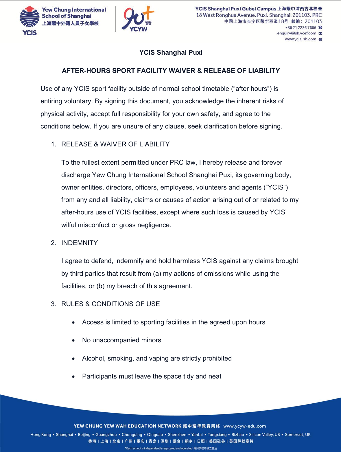 3、I have carefully read and understood the Yew Chung International School of Shanghai (Gubei Campus) Campus Entry Disclaimer.